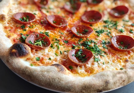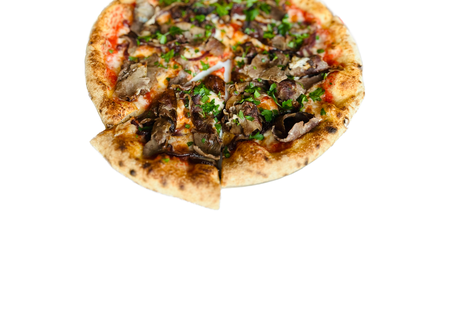 Wołowina lub kurczak- do wyboru, czerwona cebula, aromatyczny sos pomidorowy na mozzarelli fior di latte z nutą świeżej pietruszki