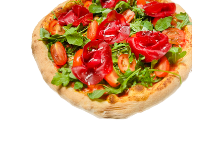 Delikatna szynka bresaola, świeże pomidory i rukola na mozzarelli fior di latte z aromatycznym sosem pomidorowym, posypane parmezanem