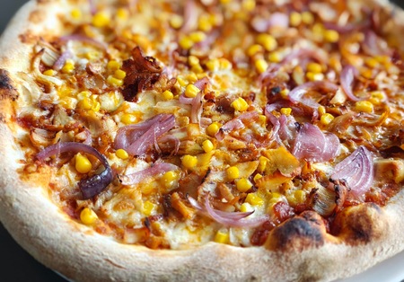 Soczysty kurczak, słodka kukurydza i cebula na sosie barbecue z mozzarellą fior di latte