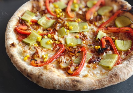 Grillowana papryka, słodka kukurydza, pikle i kurczak na sosie pomidorowym z mozzarellą fior di latte