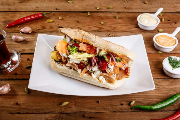 Mięso doner ,pieczone warzywa, sosy, mix sałat, pomidor, ogórek, cebula, ser typu feta podane w bułce