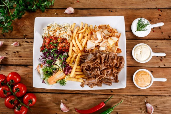 Mięso z wołowiny-yaprak, wołowina z baraniną lub kurczak-(do wyboru),kasza bulgur w orientalnym smaku, ryż lub frytki-(do wyboru), zestaw surówek, sos