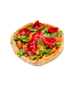 Delikatna szynka bresaola, świeże pomidory i rukola na mozzarelli fior di latte z aromatycznym sosem pomidorowym, posypane parmezanem