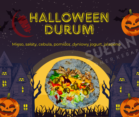 Mięso, mix sałat, pomidor, cebula, jalapeno, jogurt dyniowy zawijane w czarnym placku